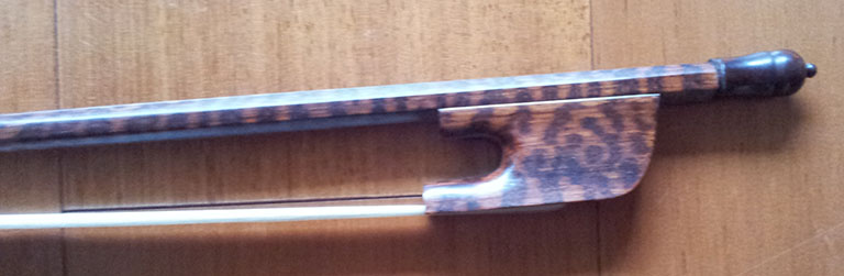 Baroque cello bow, approx. 72g, figured snakewood, round stick.