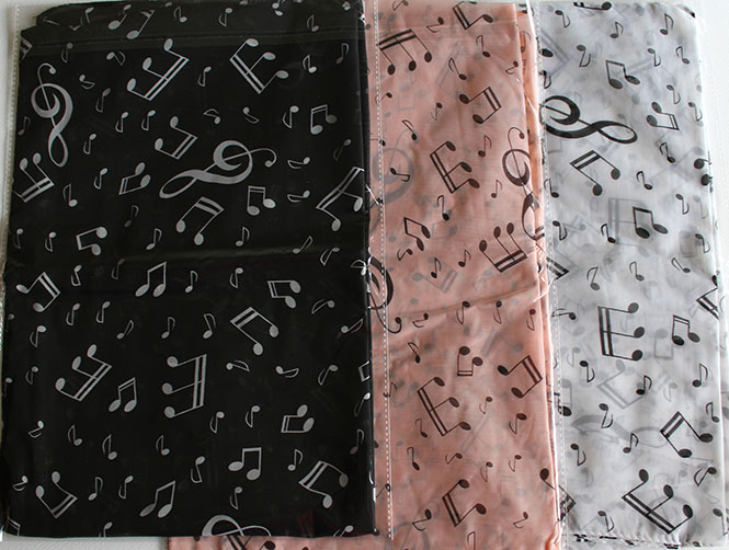 Long scarves with musical symbols. These are very lightweight polyester, in a finer weave than the infinity scarves, a little less soft, but more refined in appearance. They have nicely rolled edges. In white, pale orange and black backgrounds. $12 each or three for $30