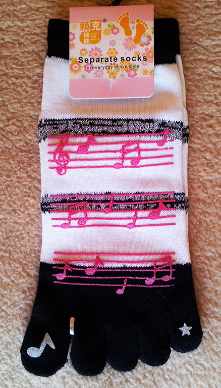 These are socks with each toe separate, and are intended for fun use only. Colours are: green/white, blue/white, orange/white, purple/white, all with black notes and black/white with pink notes. The bands near the music are slightly sparkly.